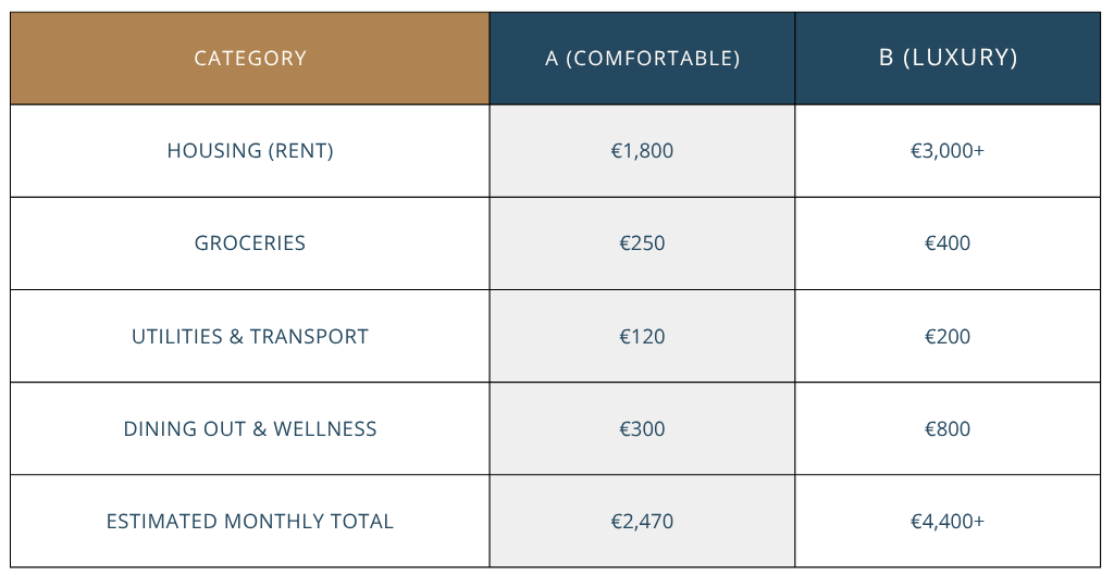 Scenario B (luxury): Rent near the coast or in a prime area for €3,000+ or buy something if you plan long term.